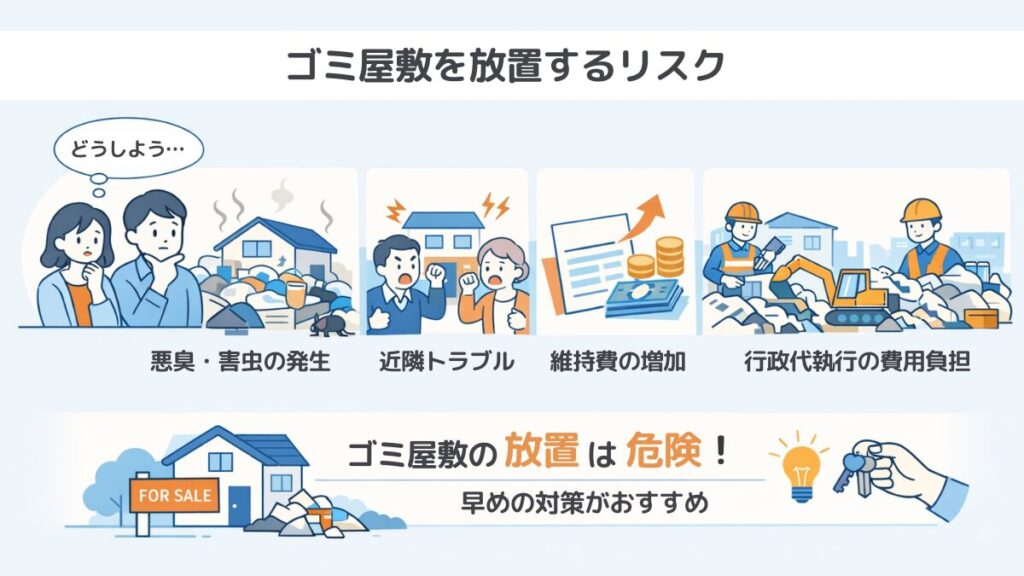 ゴミ屋敷を「見て見ぬふり」で放置し続けると、様々なリスクが現実のものとなります。
