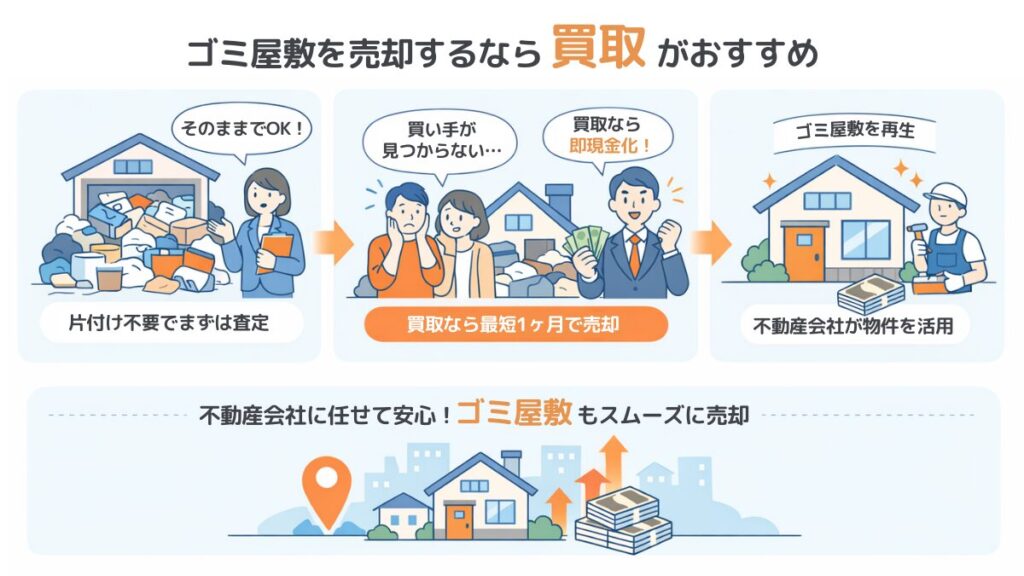 ゴミ屋敷の売却において、時間的・金銭的・精神的負担を最も軽減できるのは、不動産会社による買取と言えます。